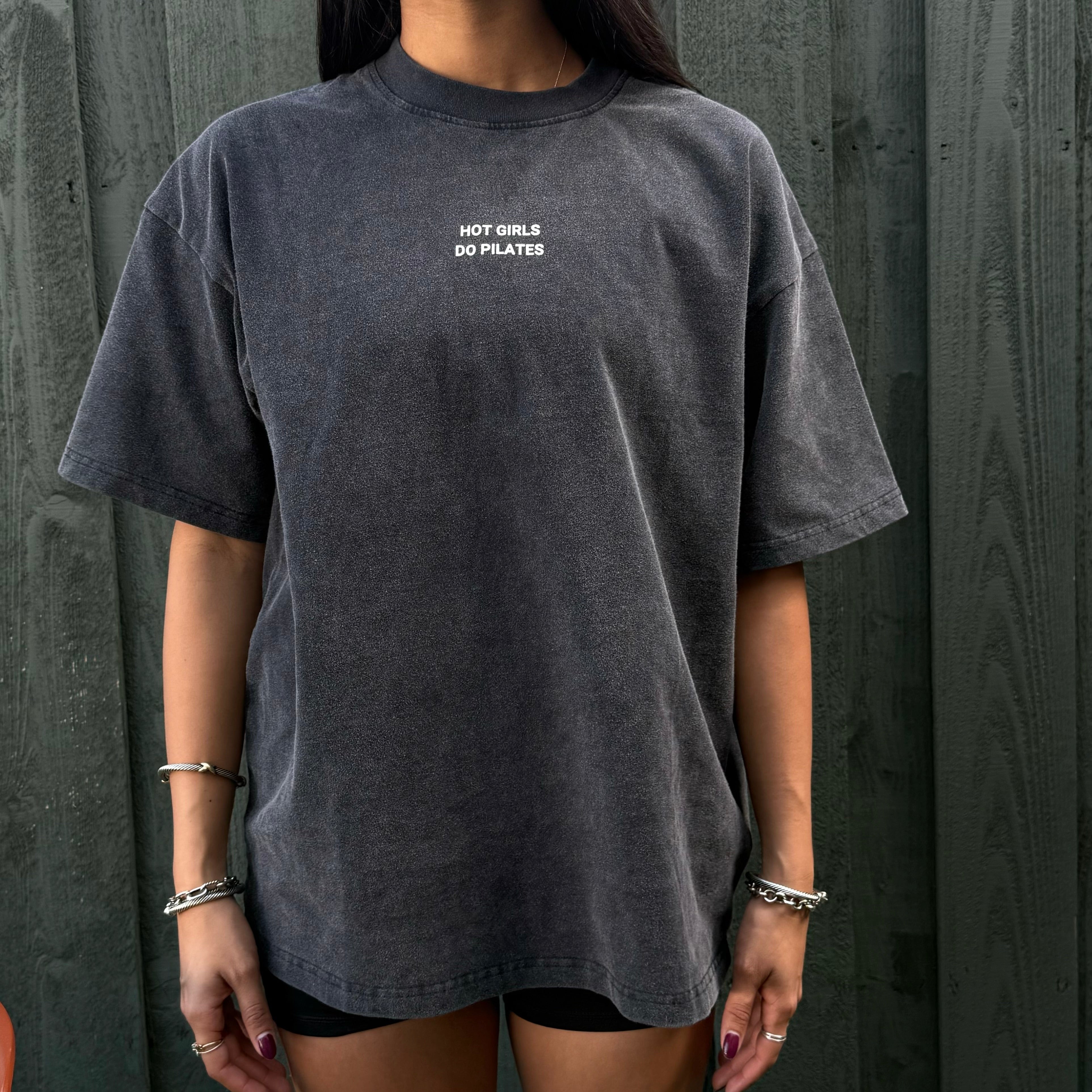 Design details: Stone-washed, screen printed "Hot Girls Do Pilates".